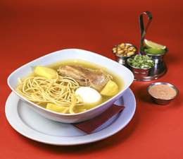 Sabroso caldo de gallina de granja, huevo duro, tallarín, patata y cebolla china.