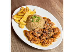 contramuslo de pollo chijaukay acompañado de patatas fritas, arroz chaufa y cremas.