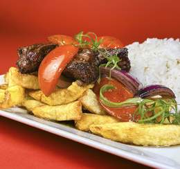 Finos y exquisitos bastones de lomo de ternera en su jugo, cebolla, tomate, cilantro y ají amarillo salteados y flambeados al wok acompañado de crujientes patatas fritas y arroz.