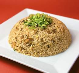 Arroz salteado al Wok con pollo, frankfurt, cebolla china, sésamo y huevo en salsa de soja y salsa de ostras