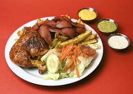 1/4 Pollo a la brasa + patatas fritas + ensalada y Frankfurt.
