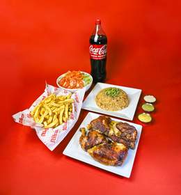 1 Pollo a la brasa + patatas fritas + ensalada clásica grande + salsas.
