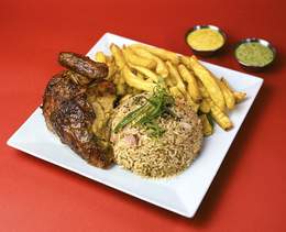 1/4 Pollo a la brasa, patatas fritas + arroz chaufa