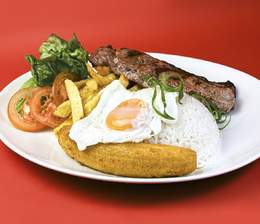 200gr de Entrecot de Vaca a la Parrilla, acompañado de Arroz Blanco, Patatas Fritas, Plátano Frito, Tomate, Lechuga, Aguacate y Huevo Frito.