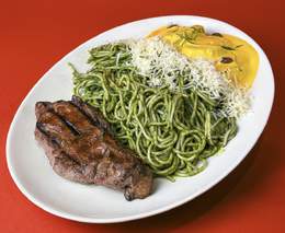 200gr de Entrecot de vaca a la Parrilla con Tallarines Verdes, Patata a la Huancaína y Queso parmesano.