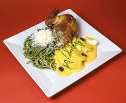 1/4 de Pollo a la Brasa con Tallarines Verdes, Patata a la Huancaína y queso parmesano.
