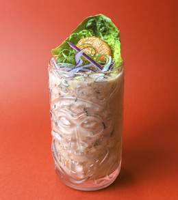 Bebida reconstituyente a base de pescado, cebolla, cilantro y zumo de limón.