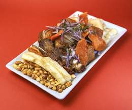 Sabrosa, jugosa y crocante costilla de cerdo frita, arropada con mote, lechuga, boniato, yuca frita y nuestra salsa criolla con hierbabuena..