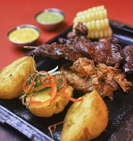 1/2 porción de rachi + 1/2 porción de mollejitas + 1 palo de anticucho + patatas cocidas + choclo.