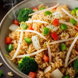 ​Delicioso Yakimeshi con arroz salteado, pimientos , cebolla , huevo, brócoli fresco y brotes de soja crujientes. ¡Un festival de sabor en cada bocado, listo para llevarte en un viaje culinario!