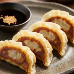 ​¡Disfruta del bocado perfecto! Nuestras gyozas son crujientes por abajo y tiernas por arriba, rellenas de una sabrosa mezcla de cerdo y verduras. Se sirven recién hechas con una deliciosa salsa de soja y jengibre para mojar.