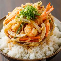 ​¡Kakiagedon, la explosión de sabor japonés que te encantará! Arroz, crujientes tempuras de gambas y verduras frescas, todo bañado en una deliciosa salsa donburi.