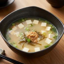 ​Una sopa reconfortante y ligera, perfecta para acompañar cualquier plato. Disfruta de la calidez de nuestro caldo de pasta de miso, preparado al estilo tradicional y servido con trozos de tofu suave, cebollino fresco y alga wakame.