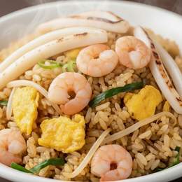 ​Disfruta de nuestro yakimeshi especial: un delicioso arroz salteado al wok con jugosos langostinos, tiernas tiras de sepia y huevo revuelto. Un clásico japonés que te transportará al instante. ¡Ideal para los amantes del sabor del mar!