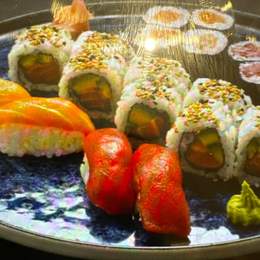 8 Arcoiris roll, dragon roll, maki langostino, maki salmón, maki aguacate, nigiri salmón, nigiri atún, nigiri langostino