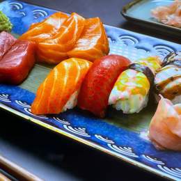 1 nigiri salmon 1nigiri atún 1nigiri anguila 1nigiri gambas 3sashimi salmón 3sashimi atún