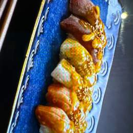 Nigiri salmón flambé, nigiri atún flambé, nigiri pez mantequilla flambé