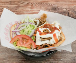 Pollo o carne con salsa blanca, salsa roja y pan de pizza turco
