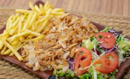 Pollo o carne con patatas, ensalada de lechuga, tomate, cebolla, salsa blanca, salsa roja y pan turco
