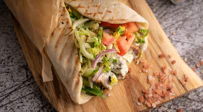 Pollo y carne de ternera con ensalada de lechuga, tomate, cebolla, salsa blanca, salsa roja y pan de pizza turco