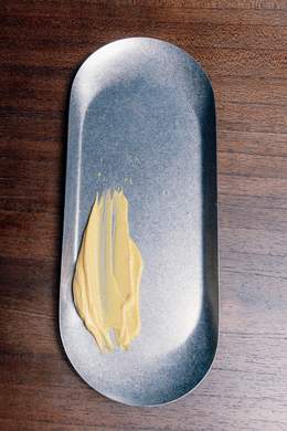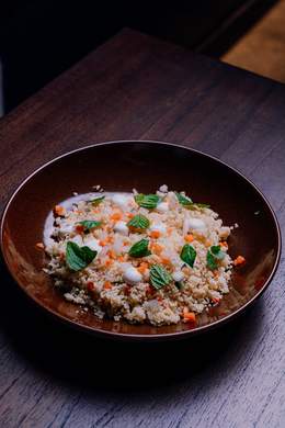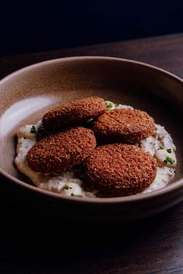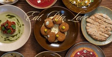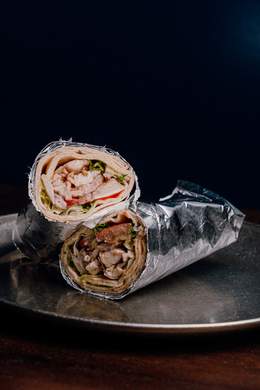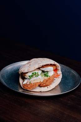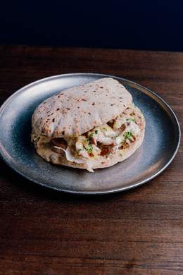 Rollo de pan plano, relleno de guiso de ternera y cocinada a fuego lento, con brasa. Demi glace de su jugo, cebolla, berenjena frita en panko, lechuga, tomate, salsas (sésamo, salsa blanca de yogur y la roja de hierbas aromáticas)