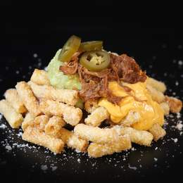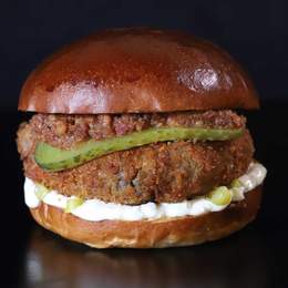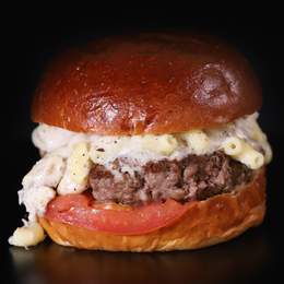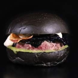 180 gr. de carne Amaren (30% buey+70% vaca), queso Gouda Black Lemon, beicon de Euskal Txerri, cebolla encurtida en cerveza negra, relish de pepinillos, rúcula y mayo kempie. Pan brioche negro.