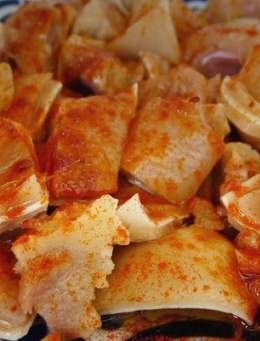 Oreja a la feria cortada con pimentón picante,aceite de oliva y patatas