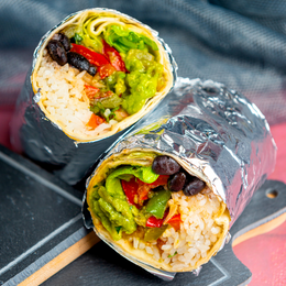 Tortilla de 30 cm rellena de arroz, frijoles, pico de gallo, lechuga y verduras con guacamole.