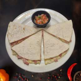 Tortilla de 30 cm rellena de jamón tipo york y nuestra mezcla de quesos, la acompañamos de pico de gallo.