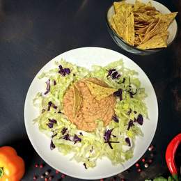 Media ración de totopos con queso, frijoles y pico de gallo.