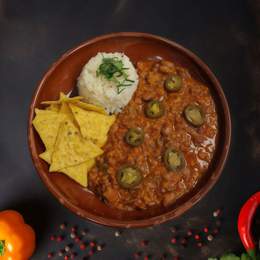 4 tacos para montar con chili con carne con arroz y totopos, acompañados de pico de gallo y 4 tortillas.
