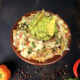 Totopos bañados con frijol refrito molido, nuestra mezcla de quesos fundidos, pico de gallo y guacamole. ( te lo enviamos por separado , para que te los puedas montar y comer recién hechos) sigue las instrucciones y caliéntalos 2 minutos en el micro