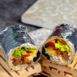 Tortilla de 30 cm rellena de arroz, frijoles, queso rallado, pico de gallo, lechuga, crema agria y fajitas de ternera.
