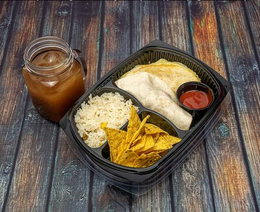 Tortilla de 30 cm rellena de arroz, frijoles, queso rallado, pico de gallo, lechuga, crema agria y pollo chipotle.