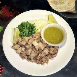 Carne de res macerada en diferentes tipos de chiles cocinada muy lentamente en caldo hasta que queda tierna. La acompañamos de limas, su caldo y 6 tortillas para que mojes tus tacos.
