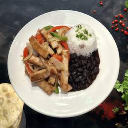 Tiras de heura salteadas con verduras, arroz y totopos, lo acompañamos de frijol y 4 tortillas.