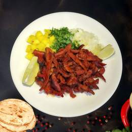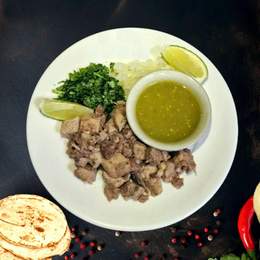 Carne de res macerada en diferentes tipos de chiles cocinada muy lentamente en caldo hasta que queda tierna. La acompañamos de limas, su caldo y 4 tortillas, para que mojes tus tacos.