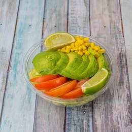 Nuestra ensalada más ligera y fresca… con una base de lechuga, tomate, aguacate, cebollita morada, maíz , sésamo y lima. *(Vegano)