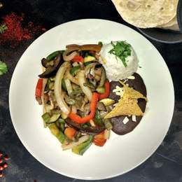 4 tacos para montar de fajitas de verdura con, arroz y totopos, acompañados de frijoles y 4 tortillas.