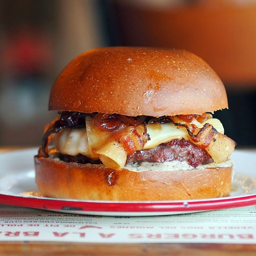 Ternera, mermelada cajún casera, gorgonzola, cebolla crujiente, mayonesa de sésamo, cebolla caramelizada, pan de brioche