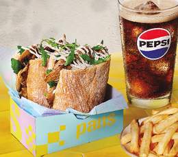 Pan cristal con masa madre y aceite de oliva, tiras de pollo crujiente, bacon, lechuga, cebolla roja encurtida, mayonesa BBQ y especias smoky BBQ + Patatas fritas o ensalada verde + Bebida