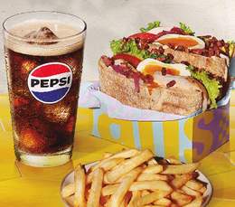 Pan cristal con masa madre y aceite de oliva, pollo asado, huevo poché, lechuga, tomate, cebolla roja encurtida, mayonesa de tomate y bacon crujiente + patatas fritas o ensalada verde + Bebida