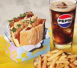 Pan rústico cantábrico, lomo asado, queso raclette, bacon, cebolla confitada, rúcula y mostaza ahumada + patatas fritas o ensalada verde + Bebida