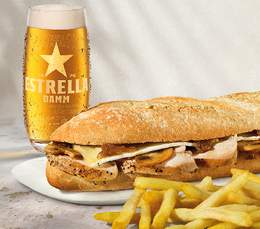 Pan Gran Reserva con pollo asado, queso brie, cebolla confitada, champiñones y margarina + patatas fritas o ensalada verde + bebida