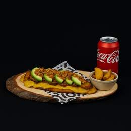 Plátano maduro caramelizado, cubierto con queso americano fundido, ternera deshilachada, láminas frescas de aguacate, crujiente cebolla frita y salsa al gusto. ¡Una armonía de sabores!.