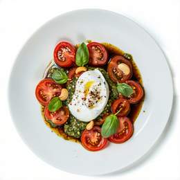 Ensalada de Tomate con Burrata, Pesto de Anacardo y Albahaca