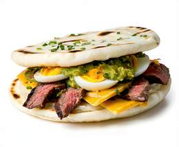 Arepas 100% de maíz con mantequilla, rellena de lechuga, tomate, carne artesanal, queso, bacon cebolla morada caramelizada, guacamole, huevo de codorniz, salsa rosada, salsa de ajo y salsa verde