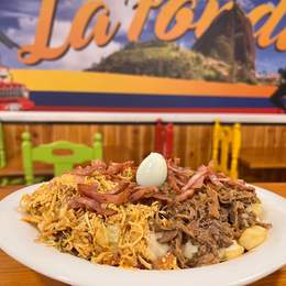 Ternera desmechada con guiso criollo, queso mozzarella, plátano maduro, salsa de la casa y huevo de codorniz