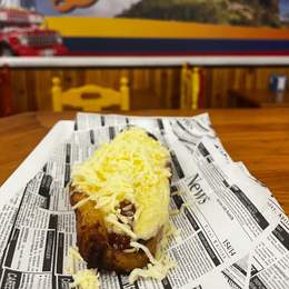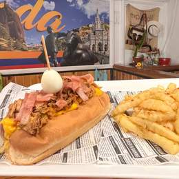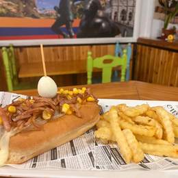 Pan brioche, doble salchicha ranchera, bacon, salsa bbq, cebolla caramelizada, queso mozzarella, maicitos, huevo de codorniz, salsas de la casa y patatas fritas