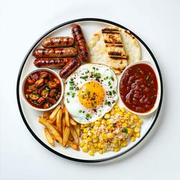 Patatas fritas, salchichas Frankfurt, queso mozzarella, pollo, ternera, bacon, huevo de codorniz y salsas de la casa